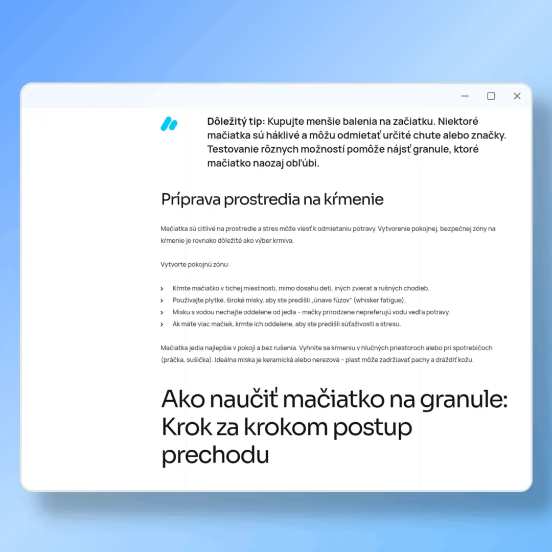Vhodnou voľbou sme aj vtedy, keď je pre vás kľúčová konzistentnosť značky. Bez „robotických“ a nezmyselných slov. Už nemusíte bojovať s nástrojmi umelej inteligencie – preskočte prompt inžiniering, limity a nechajte optimalizáciu, obrázky aj formátovanie na nás.